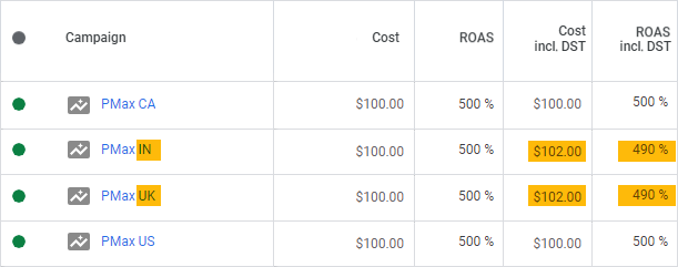Google charges digital service taxes for advertising in certain countries (e.g., a 5% surcharge for ads in Austria). These taxes are only shown on invoices, not in account statistics. Custom columns solve this problem.